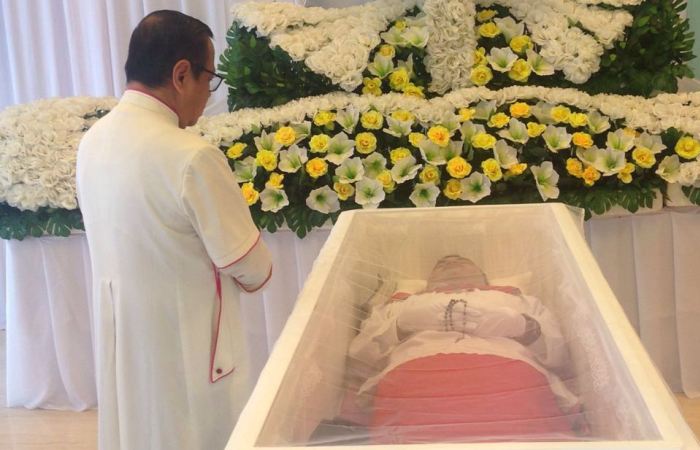 Dalam beberapa foto yang dimuat di Fanpage Facebook Keuskupan Agung Jakarta, tampak uskup ini berdoa di dekat peti jenazah Arvel.