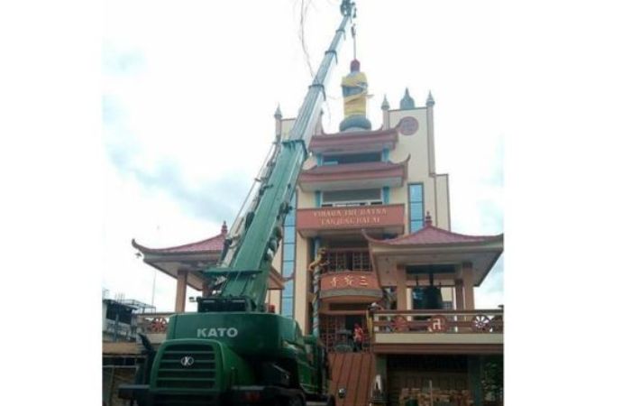 Penurunan Patung Buddha dilakukan di Vihara Tri Ratna, Tanjung Balai, Sumatera Utara. (Foto: BBC Indonesia)