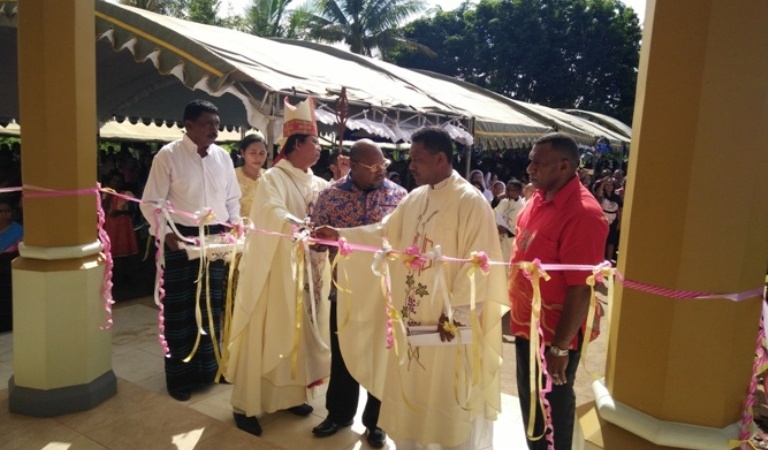 Pengguntingan pita oleh Uskup Agung Merauke, Mgr. Nikolaus Adi Seputra, Bupati Merauke, Frederikus Gebze, serta Pastor Paroki St. Petrus Erom, Pastor Raymond Raja Doren, Minggu 4 Februari 2018 (Foto: Jubi Papua).