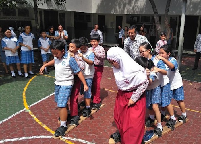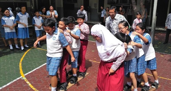 Sebagai tuan rumah, siswa-siswi dari SDK Santa Clara lantas mengajak siswa-siswi dari SD Muhammadiyah 6 Gadung bermain lomba bakiak dan enggrang.