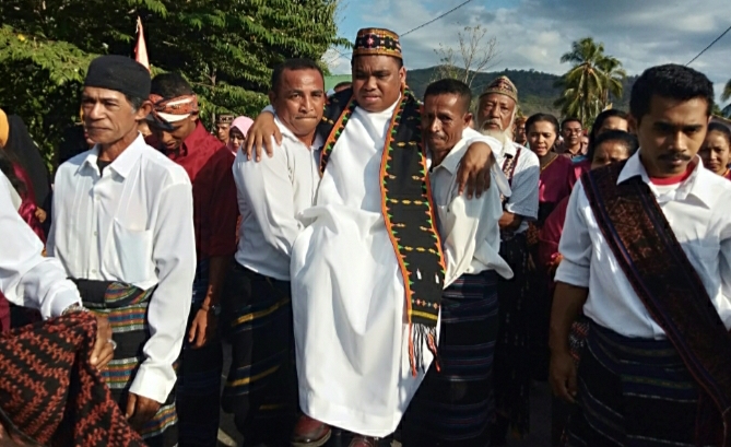 Pater Sebastianus diarak menuju ke Kelurahan Baru, Kecamatan Reok, tempat dia dibesarkan. Di situ, puluhan mmat Katolik beserta keluarga yang berlatar belakang etnis Ende telah menanti kedatangannya.