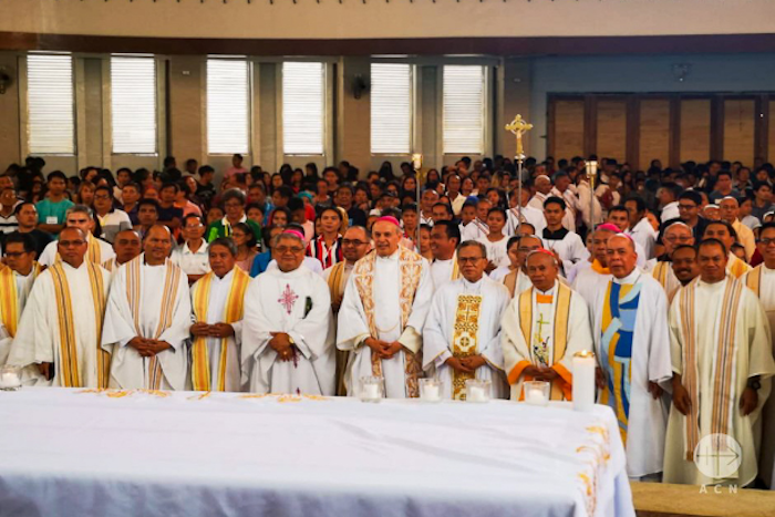 Uskup Agung Gabrielle Caccia, Duta Vatikan untuk Filipina, dan Kardinal Orlando Quevedo, Uskup Emeritus Cotabato, memimpin para uskup dan imam dalam perayaan Ekaristi.