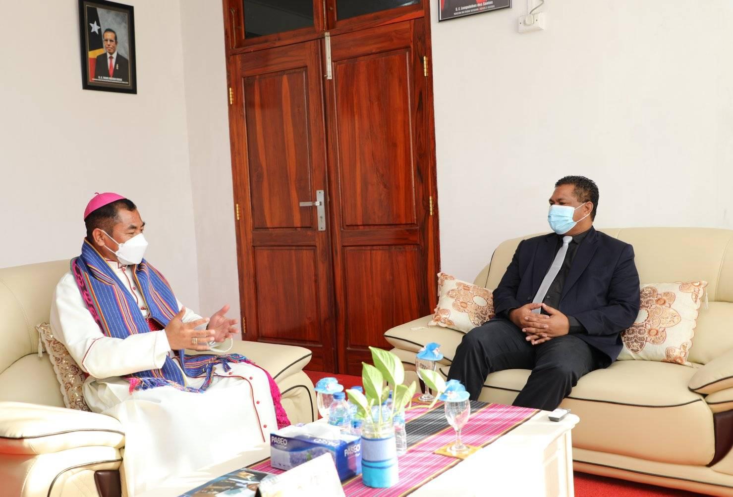 Uskup Agung Dili, Mgr Dom Virgilio do Carmo da Silva bertemu dengan Menteri Pendidikan Tinggi, Ilmu Pengetahuan dan Kebudayaan Longuinhos dos Santos pada 16 Juli untuk membahas pendirian universitas Katolik pertama di Timor-Leste. (Foto: Kementerian Pendidikan Tinggi, Ilmu Pengetahuan dan Kebudayaan)